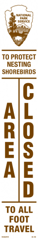 30-198 3 x 18 Strip Decal - "Area Closed To All Foot Travel - To Protect Nesting Shorebirds", NPS Logo, Wht/Brn, EG