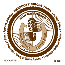 40-173 Prescott Circle Trail logo. Non-motorized. Yavapai County. City of Prescott. Yavapai Trails Association. Prescott National Forest. Embry Riddle. 3 x 3. White/brown. Reflective.