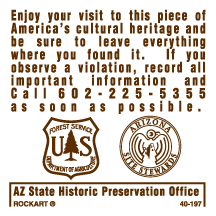 United States Forest Service - Enjoy your visit to this piece of America's cultural heritage and be sure to leave everything where you found it. If you observe a violation, record all important information and call 602-225-5355 as soon as possible. AZ site stewards AZ State Historic Preservation Office - 3 x 3 decal. White/brown. Reflective.