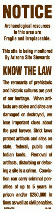 3" x 11" Strip Decal: Notice: Archaeological resources in this area are fragile and irreplaceable. This site is being monitored by Arizona Site Stewards. Know the law. The remnants of prehistoric and historic cultures are part of our heritage. When artifacts are stolen and sites are damaged or destroyed, we lose important clues about the past forever. Strict laws protect artifacts and sites on state, federal, public and Indian lands. Removal of artifacts, disturbing or defacing a site is a crime. Conviction can carry criminal penalties of up to 5 years in prison and/or $250,000 in fines as well as civil penalties. White/brown. Reflective.