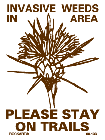 60-133Invasive weeds in area - Please stay on trails - 3 x 4 decal. White/brown. Reflective.