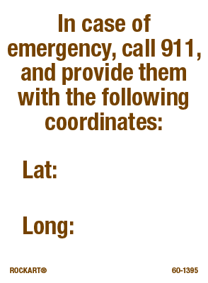 60-1395 3 x 4 Decal - "In Case Of Emergency, Call 911, And Provide Them With The Following Coordinates: Lat: Long:", Wht/Brn, EG