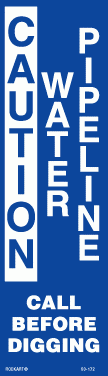 60-1723" x 10" Strip Decal with full bleed. Caution. Water pipeline. Call before digging. White/blue. Non-reflective.