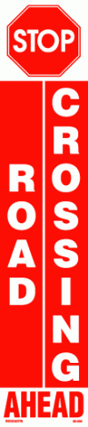 60-2333" x 14" Strip Decal: Stop. Road crossing ahead. White/red, with bleed on the sides. Reflective.