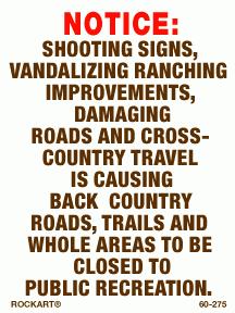 Notice: shooting signs, vandalizing ranching improvements, damaging roads and cross-country travel is causing back country roads, trails and whole areas to be closed to public recreation. 3 x 4 decal. White/brown/red. Reflective.