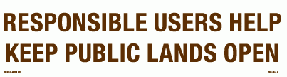 60-477Responsible users help keep public lands open. 10.25 x 2.75 horizontal strip decal. White/brown. Reflective.