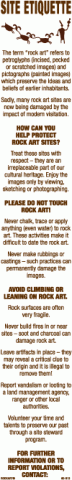 60-513 3" x 18" Strip Decal: Site etiquette. The term "rock art" refers to petroglyphs (incised, pecked or scratched images) and pictographs (painted) that preserve the ideas and beliefs of earlier inhabitants. White/brown. Non-Reflective.