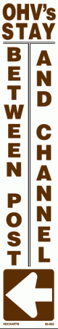 60-6023" x 16" Strip Decal. OHVs stay between post and channel. With arrow pointing left. White/brown. Reflective.