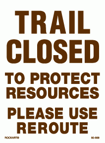 60-669Trail closed to protect resources. Please use reroute. 3 x 4 decal. White/brown. Reflective.