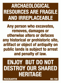 3 x 4 decal. Archaeological resources are fragile and irreplaceable. Any person who excavates, removes, damages or otherwise alters or defaces any historical or prehistoric site, artifact or object of antiquity on public lands is subject to arrest and penalty of law. Enjoy but do not destroy our shared heritage. Brown/white. Reflective.