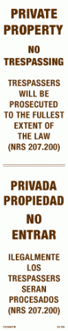 3" x 14" Strip Decal in English and Spanish. Private property. No trespassing. Trespassers will be prosecuted to the fullest extent of the law. (NRS 207.200). Privada propiedad. No entrar. Ilegalmente los trespassers seran procesados. White/brown. Reflective.