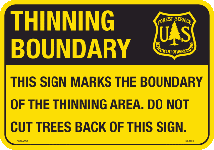 90-102310" x 7" signThinning boundary. This sign marks the boundary of the thinning area. Do not cut trees back of this sign. With the US Forest Service logo. .024 Poly-Flex. Yellow/black. Non-reflective.