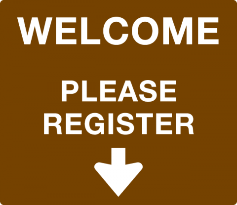 Optional Message for Registration Box Lid - "Welcome / Please Register" (w/ Down Arrow), White