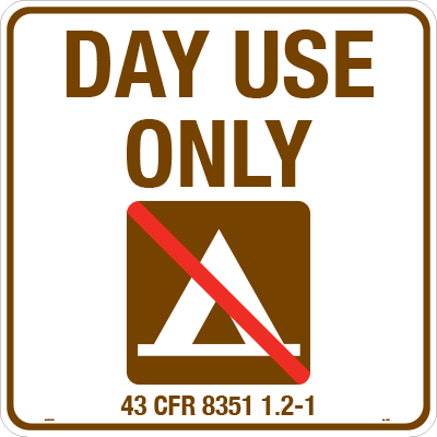 90-112324 x 24 x .080 Alum. Sign - "Day Use Only - No Camping", Wht/Brn/Red, EG