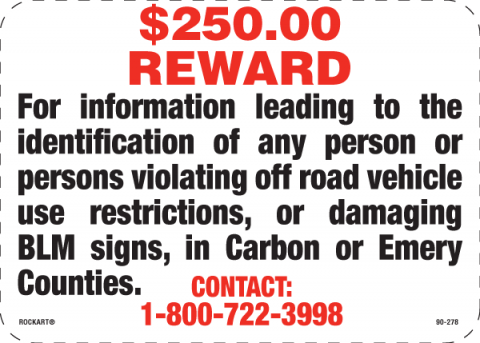 7 X 5 PolyFlex Sign - "$250 Reward Sign - BLM - Carbon or Emery Counties", Wht/Blk/Red, Non-Reflective