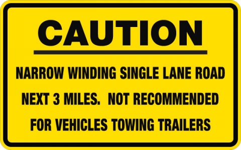 48 x 30 x .125 Alum. Sign - "CAUTION - Narrow Winding Single Lane Road Next 3 Miles - Not Recommended for Vehicles Towing Trailers", Yel/Blk, HIP