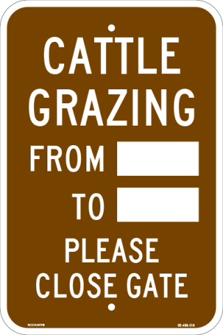 12 x 18 x .080 Alum. Sign - "Cattle Grazing From ___ To ___ Please Close Gate", Wht/Brn, EG