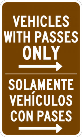 90-499-602 18 x 30 x .080 Alum. Sign - "Vehicles With Passes Only (Right Arrow)" English/Spanish, Wht/Brn, EG