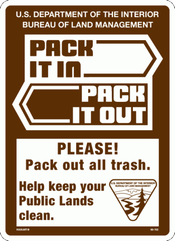 90-702 8" x 11" sign. U.S. Department of the Interior, Bureau of Land Management. Pack it in, pack it out. Please! Pack out all trash. Help keep your public lands clean. With the BLM logo. .05 Poly-Flex. White/brown. Non-reflective.