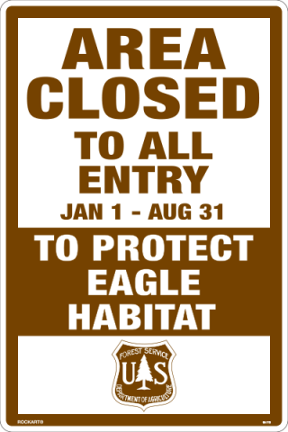 90-773 12 x 18 x .050 PolyFlex Sign - "Area Closed To All Entry Jan 1 - Aug 31, To Protect Eagle Habitat", w/USFS Logo, Wht/Brn, NREF