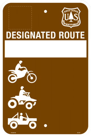 12 x 18 x .080 Alum. Sign - "DESIGNATED ROUTE" Travel Mgmt Base w/symbols for Dirt Bike, ATV & 4WD", w/ USFS Logo, Wht/Brn, EG