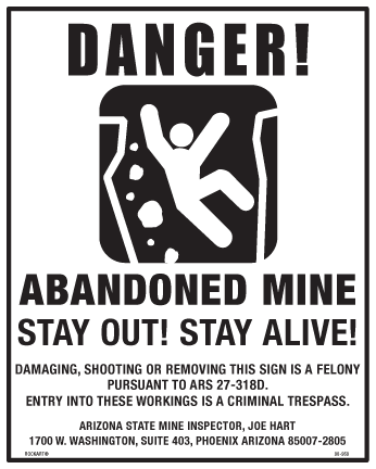 Danger! Abandoned mine. Stay out! Stay alive! Damaging, shooting or removing this sign is a felony pursuant to ARS 27-318D. Entry into these workings is a criminal trespass. Arizona State Mine Inspector, Joe Hart. 1700 W. Washington, Suite 403, Phoenix Arizona 85007-2805. .032 Aluminum. White/black. Non-reflective.