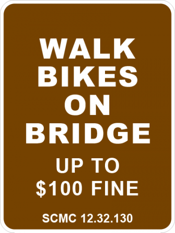 18 x 24 x .080 Alum. Sign - "Walk Bikes On Bridge - Up to $100 Fine - SCMC 12.32.130", Wht/Brn, EG