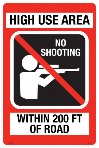 12 x 18 x .070 PolyFlex Sign - "High Use Area - No Shooting within 200FT of Road" text & graphic, Wht/Black/Red, NREF
