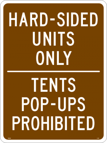 24 x 32 x .080 Alum. Sign - "Hard-Sided Units Only-Tents Pop-Ups Prohibited", Wht/Brn, EG