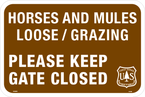 18 x 12 x .080 Alum. Sign - "Horses And Mules Loose / Grazing - PLEASE KEEP GATE CLOSED", w/ USFS Logo, Wht/Brn, EG