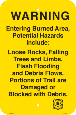 12 x 18 x .080 Alum. Sign - "WARNING - Entering Burned Area, Potential Hazards Include...", w/ USFS Logo, Yel/Blk, EG