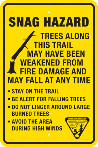 12 x 18 x .050 PolyFlex Sign - "SNAG Hazard - Trees Along This Trail May Have Been Weakened From Fire Damage and May Fall at Any Time...", BLM Logo, Yel/Blk, NREF