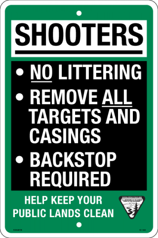 12 x 18 x .070 PolyFlex Sign "SHOOTERS - No Littering / Remove All Targets And Casings/ Backstop Required, Help Keep Your Public Lands Clean", BLM Logo, Wht/Blk/Grn, NREF
