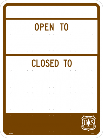 18 x 24 x .080 Alum. Sign - "Open To / Closed To (All Blank)", w/ USFS logo, Wht/Brn, EG