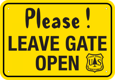 10 x 7 x .032 Alum. Sign - "Please! Leave Gate Open", w/ USFS Logo, Yel/Blk, NREF, 22-9B