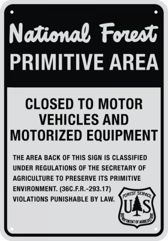 7 x 10 x .032 Alum. Sign - "National Forest Primitive Area - Closed to Motor Vehicles and Motorized Equipment...", w/ USFS Logo, Gray/Blk, NREF, 27-6