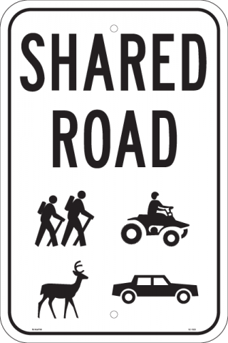 12 x 18 x .080 Alum. Sign - "Shared Road - w/symbols for ATV, 2WD Car, Hikers and Deer", Wht/Blk, EG