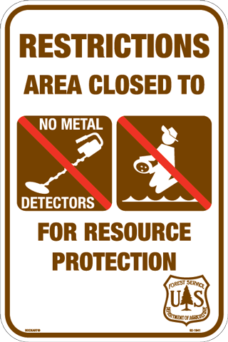12 x 18 x .080 Alum. Sign - "Restrictions - Area Closed To (w/ symbols for No Metal Detectors / No Gold panning) - For Resource Protection", w/ USFS Logo, Wht/Brn/Red, EG