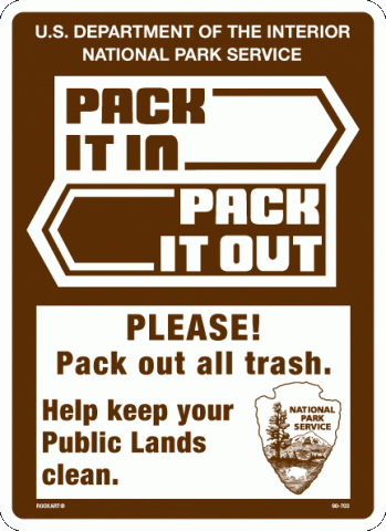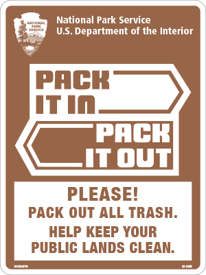 U.S. Department of the Interior, National Park Service. Pack it in, pack it out. Please! Pack out all trash. Help keep your public lands clean. w/ National Park Service logo. White/brown. Non-Reflective.