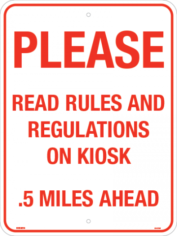18 x 24 x .080 Alum. Sign - "Please Read Rules And Regulations On Kiosk .5 Miles Ahead", Wht/Red, EG