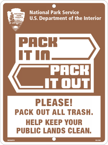 9 x 12 x .063 Alum. Sign - "National Park Service US Department of the Interior, Pack It In Pack It Out, Please! Pack Out All Trash. Help Keep Your Public Lands Clean.", Wht/PMS 1615, NREF