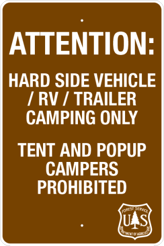 24 x 36 x .080 Alum. Sign - "Attention: Hard Side Vehicle / RV / Trailer Camping Only, Tent And Popup Campers Prohibited" w/ USFS Logo, Wht/Brn, HIP