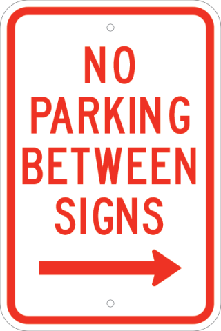 92-218412 x 18 x .080 Alum. Sign - "No Parking Between Signs (Right Arrow)", Wht/Red, HIP