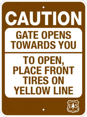 18 x 24 x .080 Alum. Sign - "CAUTION, Gate Opens Towards You, To Open, Place Front Tires On Yellow Line", w/ USFS Logo, Wht/Brn, EG