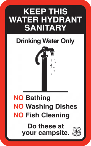 5 x 8 x .050 Polyflex Sign - "Keep This Water Hydrant Sanitary, Drinking Water Only, No Bathing, No Washing Dishes, No Fish Cleaning, Do These At Your Campsite.", w/ USFS Logo, Wht/Blk/Red, NREF