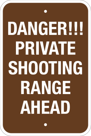 92-249712 x 18 x .080 Alum. Sign - "Danger!!! Private Shooting Range Ahead", Wht/Brn, HIP