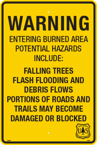 24 x 36 x .080 Alum. Sign - "Warning Entering Burned Area Potential Hazards Include: Falling Trees Flash Flooding And Debris Flows Portions Of Roads And Trails May Become Damaged Or Blocked", W/ USFS logo, Yel/Blk, HIP