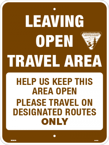 18 x 24 x .080 Alum. Sign - "Leaving Open Travel Area, Help Us Keep This Area Open, Please Travel On Designated Routes Only", W/ BLM Logo, Wht/Brn, EG