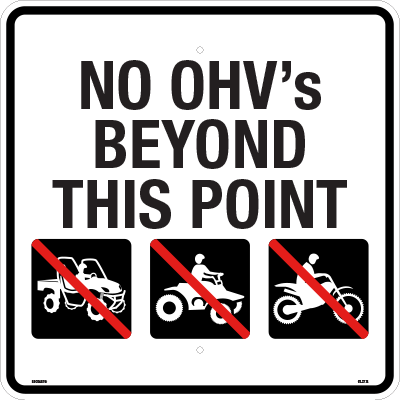 24 x 24 x .080 Alum. Sign - "No OHV's Beyond This Point", W/ No Side By Side, No ATV, No Motorbike Symbols, Wht/Blk/Red, HIP