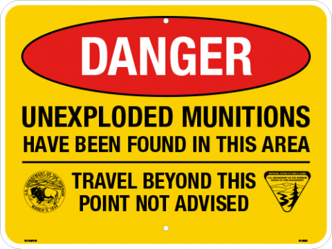 24 x 18 x .080 Alum Sign - "Danger Unexploded Munitions Have Been Found In This Area Travel Beyond This Point Not Advised", W/ DOI & BLM Logos, Full Color, EG